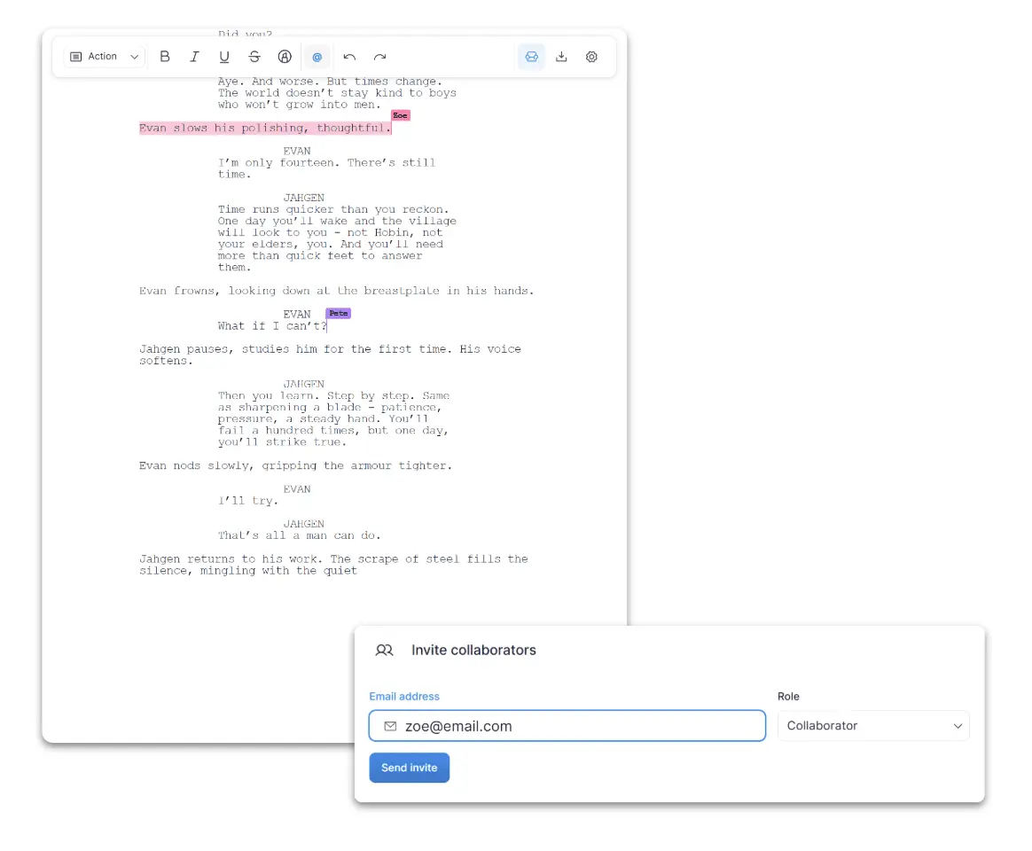 Neptune makes collaboration seamless — invite co-writers, script advisors, directors, concept artists, or even financiers into your project. Share your work live, get feedback instantly, and keep everyone on the same page.