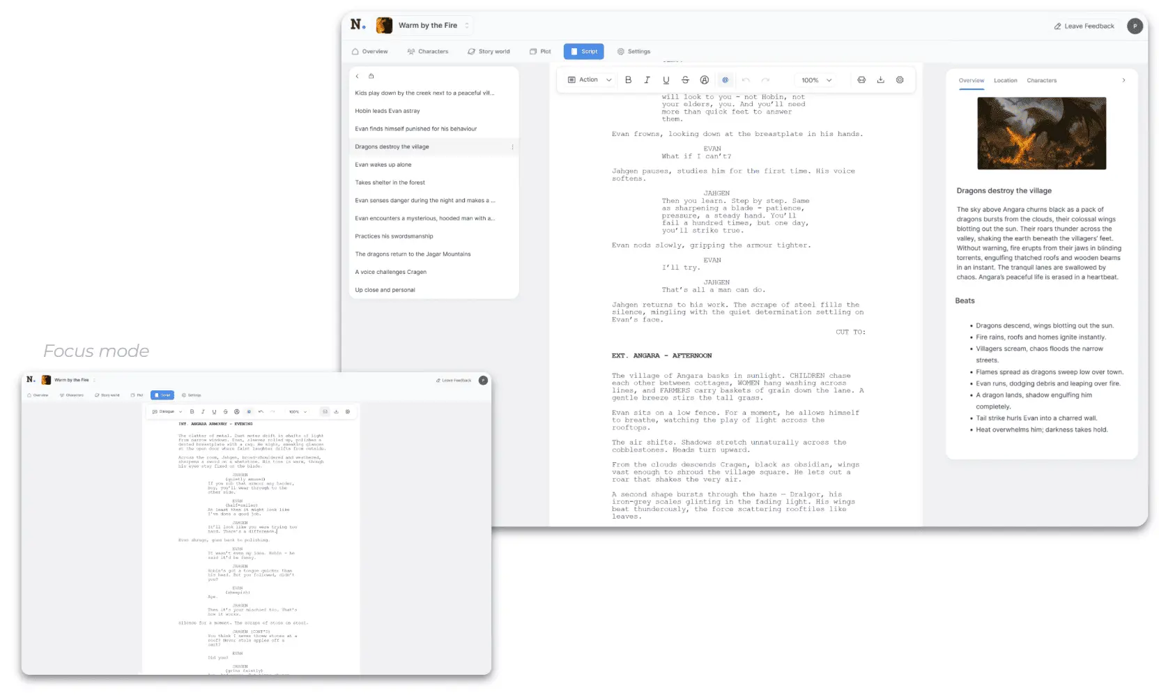 It gives you everything you need at your fingertips: connected scenes, character notes, location details and real-time collaboration, all in one place. And when it’s time to tune out the noise, Focus Mode lets you retreat into a clean, minimalist writing space — just you and the page.
