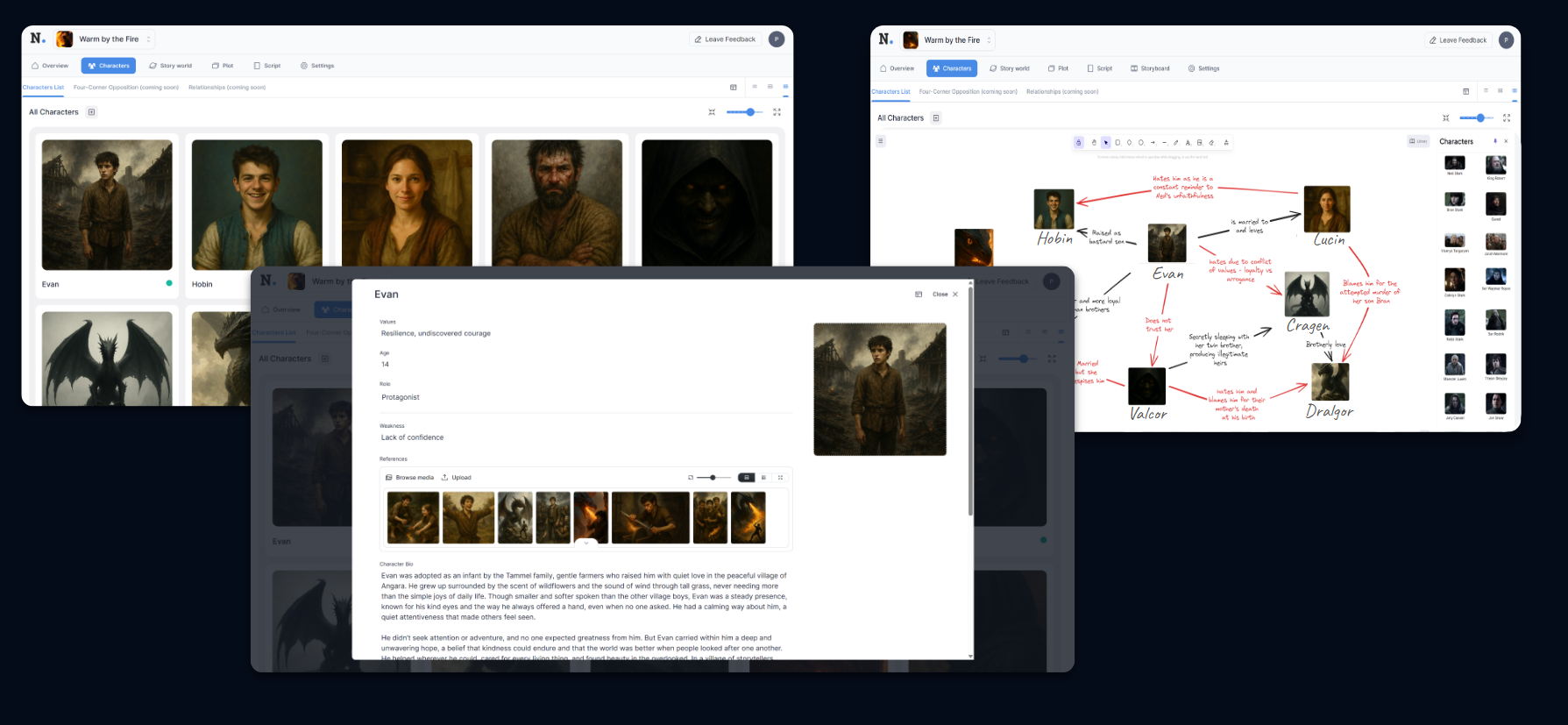Build rich backstories, define values and flaws and explore inner conflicts using modern storytelling frameworks that help you spark tension and growth.