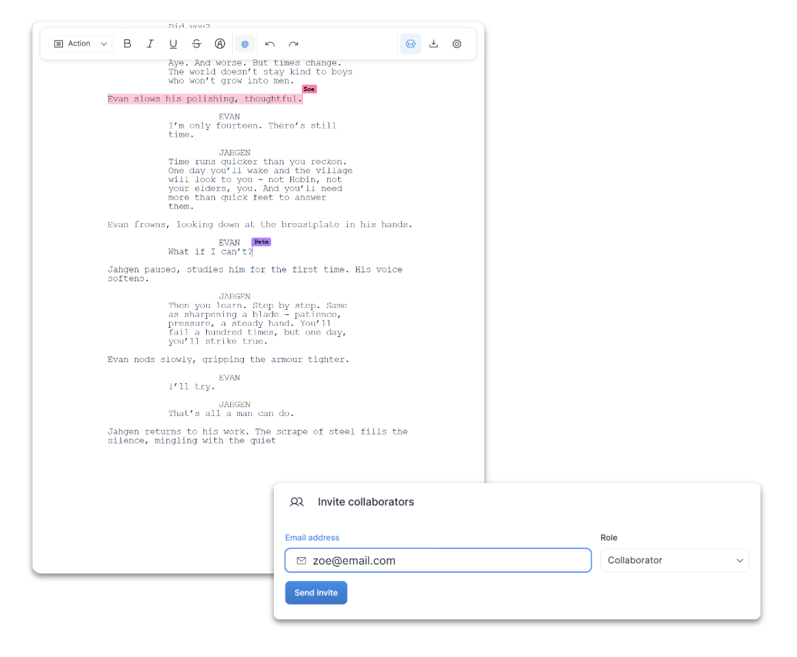 Neptune makes collaboration seamless — invite co-writers, script advisors, directors, concept artists, or even financiers into your project. Share your work live, get feedback instantly, and keep everyone on the same page.